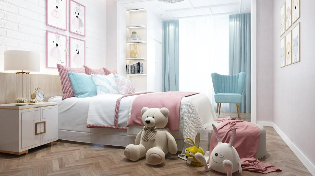 This is a kid’s bedroom design full of warmth and elegance in American Style, skillfully blending classic American design elements with playful touches. The space is based on soft, light tones, and the white brick walls convey the rustic charm of American Style interior design, while the pink-themed soft furnishings maintain the coziness typical of American homes and the lively feel suitable for children. The pink-and-white bedding and intricately patterned pillows showcase the American Style decor focus on comfort and detail. The white bedside table with gold accents adds a touch of American-style light luxury, and the vintage-style table lamp subtly reflects American Style vintage design.