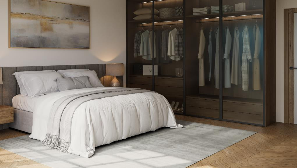A clever glass wardrobe design keeps clothing organized and the room tidy. Wall art in soft tones complements the overall light color palette, and the area rug softens the wooden floor’s rigidity. This bedroom embodies the essence of American Style cozy interiors, providing a space that feels like a gentle embrace the moment you step in.