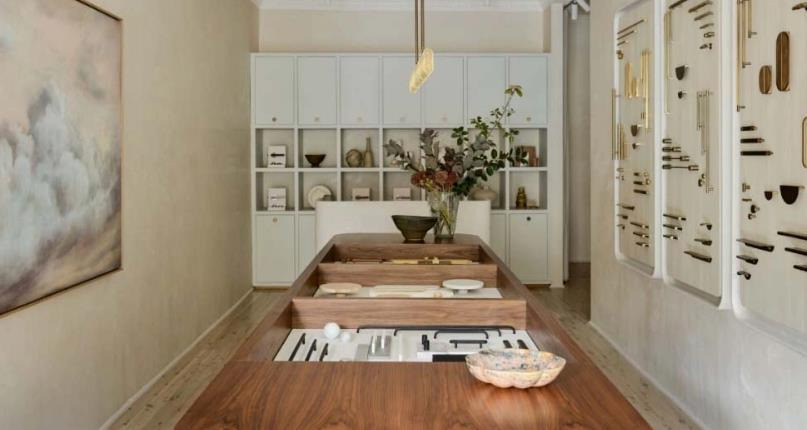 This space is not just a traditional dining room but a stylish home showroom, combining display and dining functions with an elegant design. Light wood floors and beige walls create a warm, inviting base. The dark wood table serves both as a dining surface and a display area for home decor items, complementing the floral arrangements and adding a touch of American Style dining room decor.