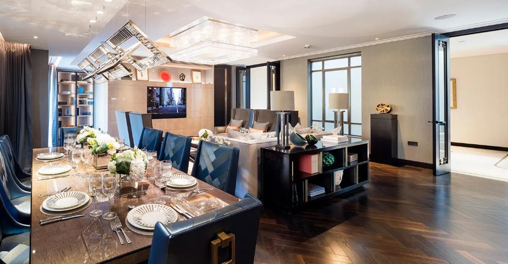 This open-plan living and dining space exemplifies modern luxury in American Style home design, with every detail reflecting refinement and elegance. The dining area features a dark wood table paired with deep blue leather chairs, accented by metallic details for a luxurious feel. Neatly arranged tableware and fresh floral arrangements complement the gold pendant lights, creating a ceremonial dining atmosphere.