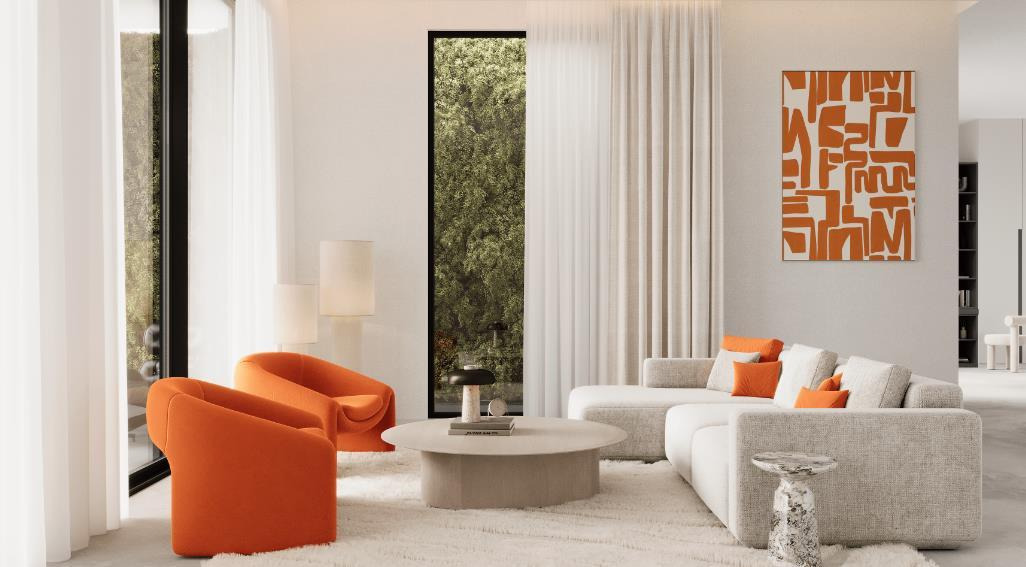 This living room design blends modern minimalism with vibrant colors, radiating style and comfort. White and light gray serve as the base colors, creating a clean, open visual. Floor-to-ceiling windows and glass doors bring in abundant natural light, connecting the outdoor greenery seamlessly with the interior, an essential feature of American Style living spaces.