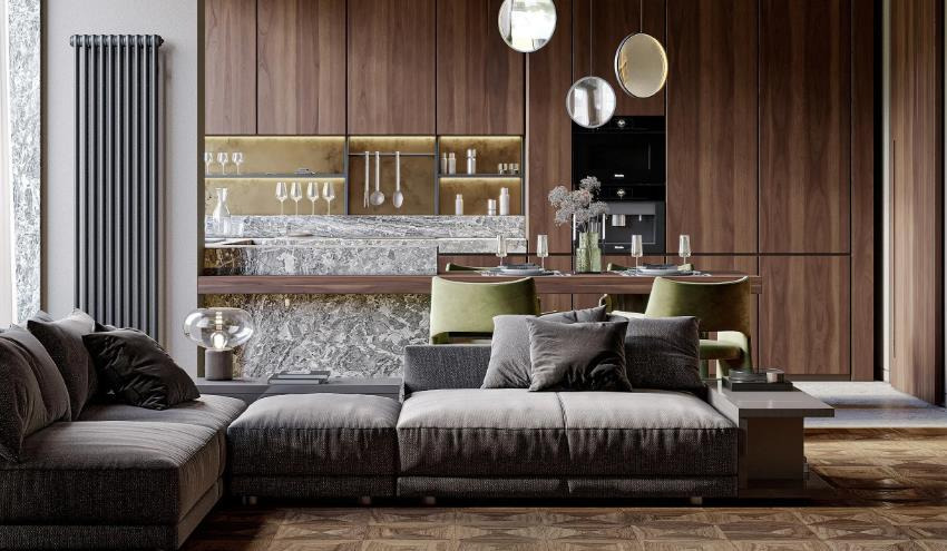 Deep wood elements from the dining and dining room areas extend into the living space, harmonizing color and texture while conveying subtle luxury. The intricate wooden parquet flooring adds natural sophistication, making this living area both comfortable and refined, embodying the relaxed elegance of American Style interiors.