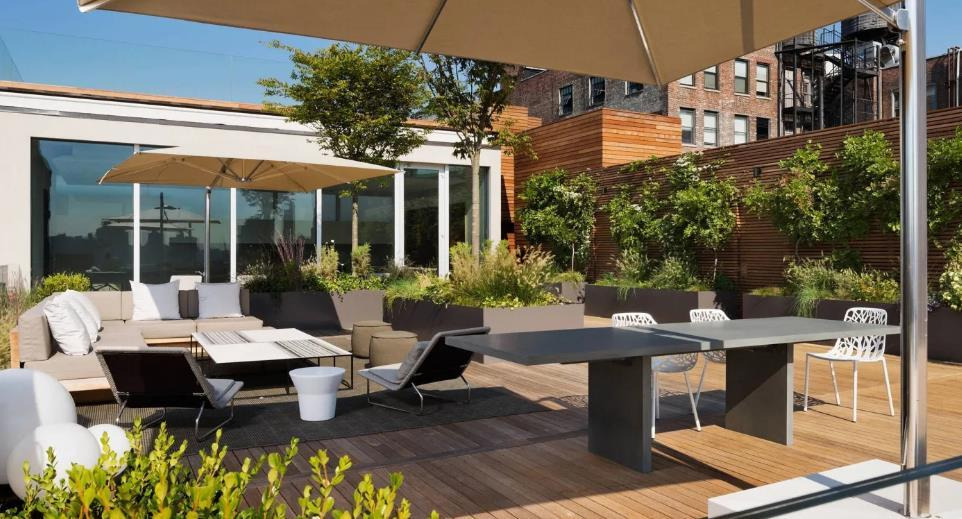 The greenery is arranged naturally, with plants in black planters complemented by wooden fences, conveying a lifestyle that is close to nature and embraces freedom. Overall, this yard combines leisurely comfort with refined modern design, vividly embodying American Style outdoor living.