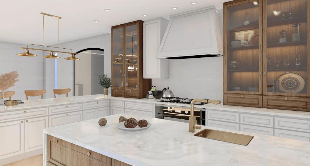 The wooden cabinets, crafted from high-quality solid wood, showcase clear, natural textures and rustic charm. Some cabinets have glass doors for displaying tableware, adding an element of American Style kitchen decor sophistication. Contrasting with white countertops and walls, gold faucets and pendant lighting introduce subtle American-style luxury. The kitchen island continues the use of wood, blending functionality with a warm gathering spot for family and friends. Built-in appliances, vintage gold pendant lights, and arched wall designs all work together to form a cohesive American Style kitchen interior, where every detail reflects a love for natural materials and comfortable living.