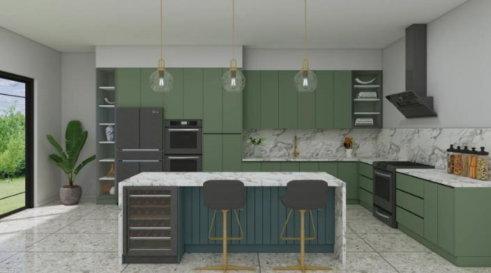 Surrounding cabinets integrate seamlessly with built-in appliances, ensuring functionality while keeping the space neat and spacious. Large floor-to-ceiling windows bring in abundant natural light, enhancing the comfortable and sophisticated cooking environment. Three transparent glass pendant lights with gold fixtures serve both as functional lighting and artistic decor. Cabinets with flat-panel doors and a built-in wine rack under the island add practicality and leisure, while the marble countertop and backsplash contribute to the refined texture typical of American Style interior design. Dark green cabinets act as a visual focal point, balanced by gray appliances and chairs, with gold fixtures providing elegant accents, creating a modern yet lively American Style kitchen space.