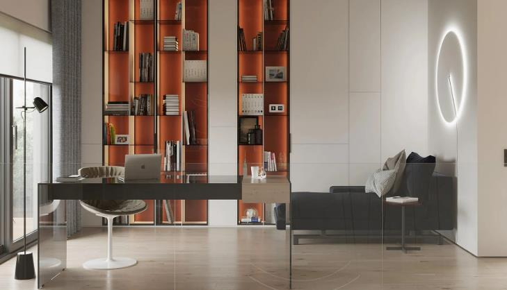 A vibrant orange built-in bookshelf serves as the focal point, its open layout and rich display of books and decor showcasing the personalized charm of American Style study room ideas. The black glass desk and stylish chair feature modern lines with subtle elegance, while a dark gray sofa arrangement offers a relaxed space to read and rest. The circular wall light adds artistic flair, making this office a perfect combination of casual comfort and modern simplicity typical of American Style interiors.