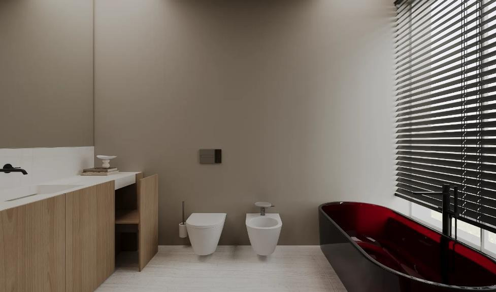 The black bathtub with a red interior serves as a visual highlight, adding bold personality, while black shutters maintain privacy and complement the modern vibe. Simple white sanitary ware harmonizes with the overall design, balancing functionality with aesthetic appeal, resulting in a sophisticated American Style home bathroom.