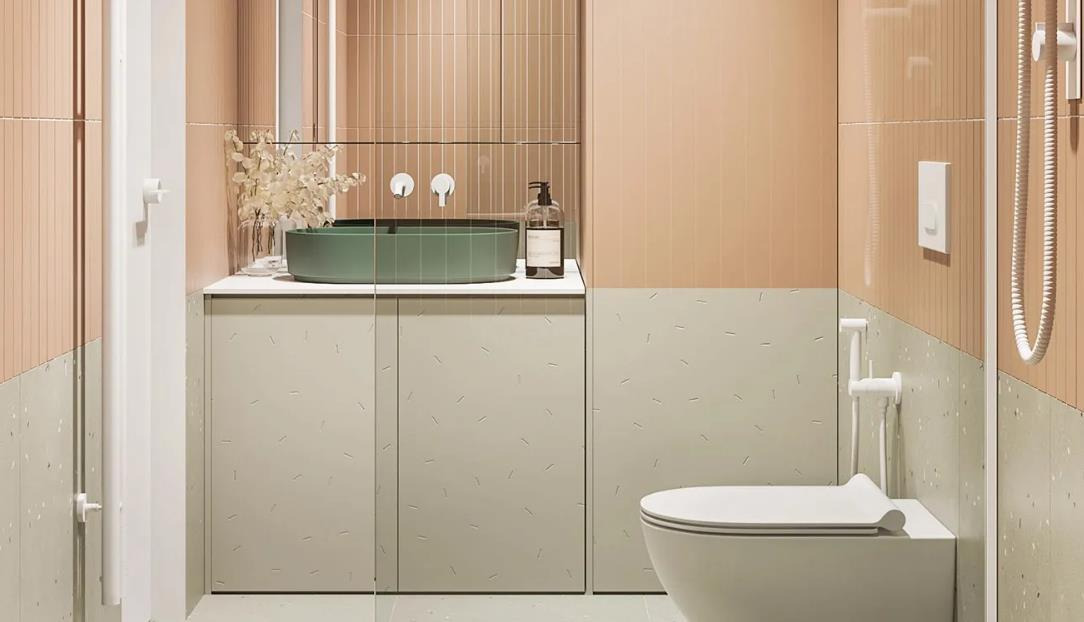The bathroom features warm, soft tones with delicate textures on pale pink walls and light gray lower walls. The cabinets echo the wall colors and provide a clean, airy feel. A dark green vessel sink contrasts with white faucets, reflecting American Style bathroom decor. Decorative elements such as dried flowers add life and personality, enhancing the American Style small bathroom ideas. Overall, this space combines gentle colors, practical layouts, and modern fixtures to create a comfortable and stylish American-inspired bathroom.