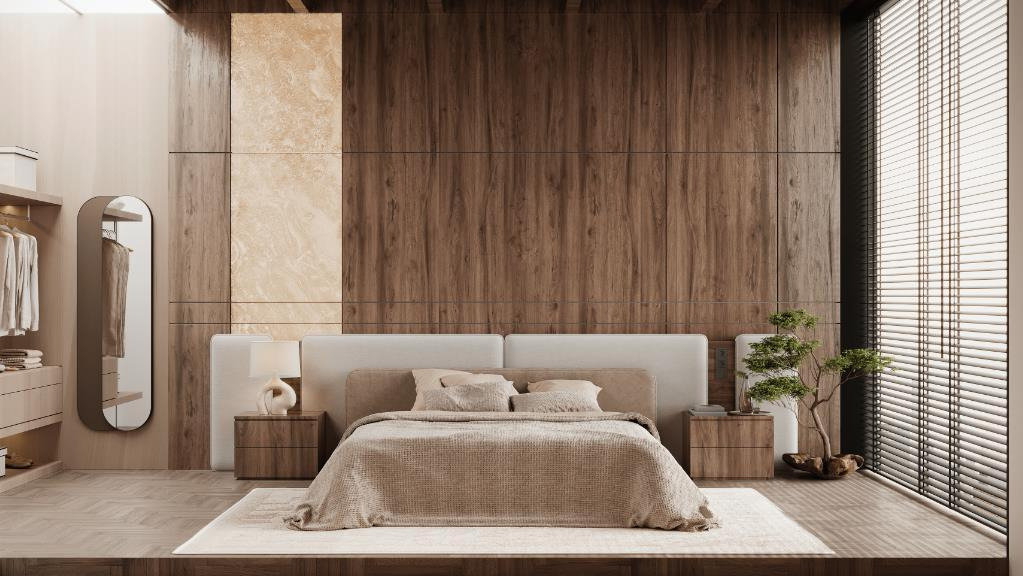 This bedroom design perfectly combines natural textures with modern minimalism, creating a calm and elegant atmosphere. The space uses various shades of wood as the primary base, with a large wooden feature wall showing clear natural grain, bringing a strong sense of nature. Herringbone wooden floors convey warmth and rustic charm, typical of American Style interior design.